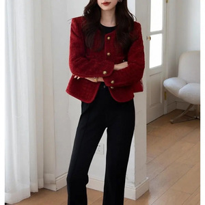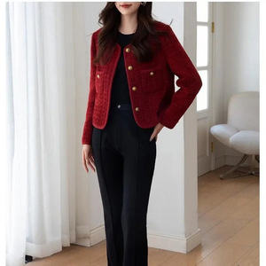 新商品の重工のワインレッドの小さい香風のコートの女性の秋冬のフランスの気質の百合の名媛の粗い花の上着