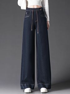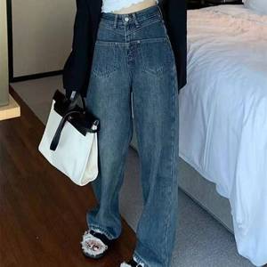 腰のジーパンの女性の春の新型のファッションの高い腰のゆったりしているストレートなズボンの百合はやせている広腿のズボンの長いズボンを現します。