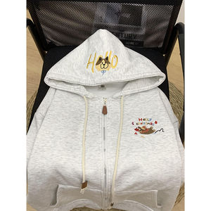 かわいいソーセージの子犬の刺繍とベルベットの厚い帽子のカーディガンの女性の秋冬の小さい背のゆったりしたジッパーのコート