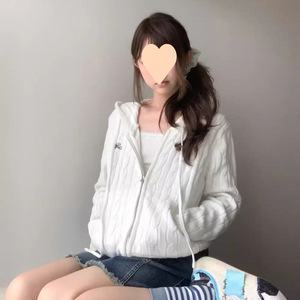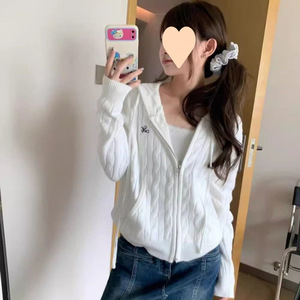 韓国系の柔らかいモチモチの白い麻花のセーターのコートの女性の春秋の小さい背はやせています。