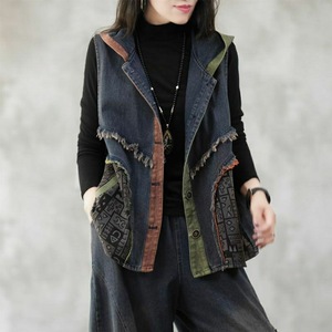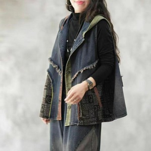 レトロな色のデニムの帽子のデニムのベストのカジュアルでゆったりしている大きい版の肉を遮ってつなぎ合わせて布の毛の縁の1枚のセットの女性を貼ります。