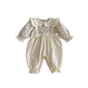 韓国版春秋モデルの女の子の長袖の偽の2つのストラップの連体服の赤ちゃんの洋気の子供の襟の服のファッション