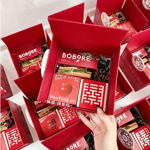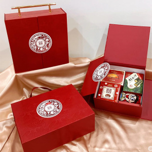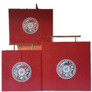 金色の手持ち式両開き「喜」字入りギフトボックス、結婚式のお菓子箱、赤い特殊紙、エンボス加工ロゴ、工場直送