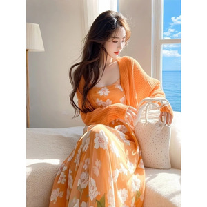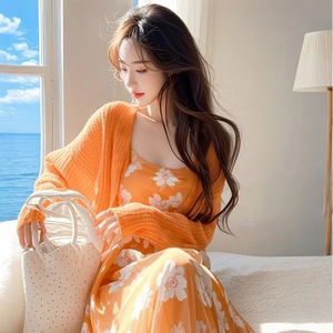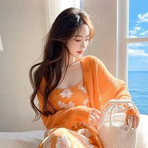春には、太ったmmのカーディガンの花のサスペンダーのスカートを着て、独特の美しいオレンジ色の2つのセットの女性を着ています