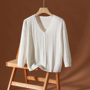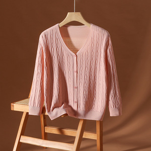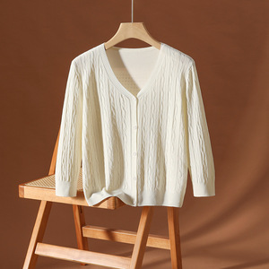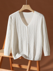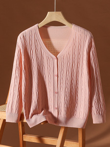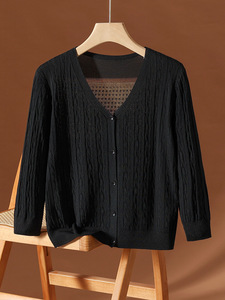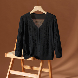 短いvネックの氷の糸のニットのカーディガンの上着の女性の夏の7分の袖はストラップのスカートのストールの外で日焼け止めのシャツを掛けます。