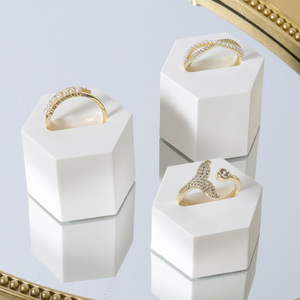 シンプルなリングの展示棚の幾何学的なアクセサリーの展示棚の指輪のトレーの棚は白い宝石のアイデアを収めて写真を撮ります。