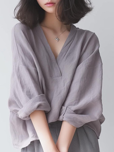 フレンチパープルVネック長袖シャツ、女性用、秋と夏、薄手、2025年新作、高級感、ゆったりとしたカジュアルトップス