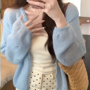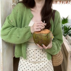 女性の早春の小柄な透かし彫りの短いニットのカーディガンは通勤しています。