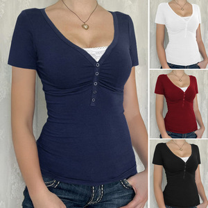 クロスボーダー2025春夏アマゾン欧米y 2k気質カジュアルボタン純色vネックニット半袖上着女装