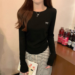 韓国系の灰色の刺繍の丸首の長袖の底のシャツの女性の春と秋冬の中で重ねてしわを着て身を修める純綿の上で服を着ます。