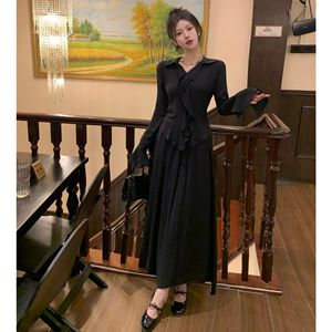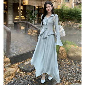 2025春夏の新しい優しい薄いタイプのハイウエストはフランスのレトロなフリルのシャツの半身のスカートの薄い2つのセットの女性を現します。