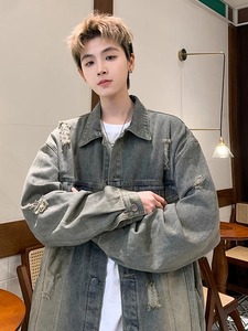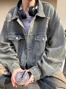 初秋の破れた穴のデニムのコートの男性の春秋のタイプのファッションのブランドの高級感のごろつきのハンサムでゆったりしているアメリカのジャケットの復古の上で服を着ます。
