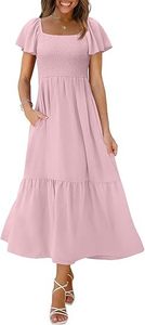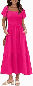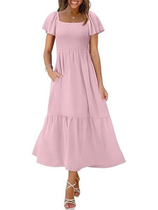 2025 Amazon 新しい女性のロングドレススクエアネックフローティングスリーブプリーツドレスポケット付き