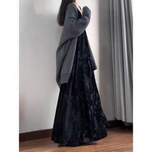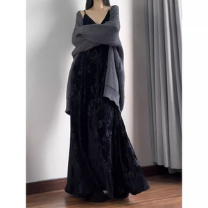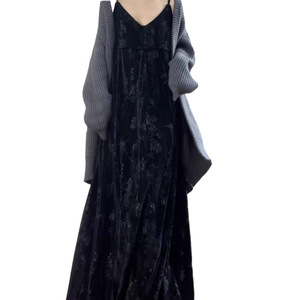 ベルベットワンピースセット女性新中国風復古プリントストラップ禅意ニットカーディガン2点セット