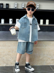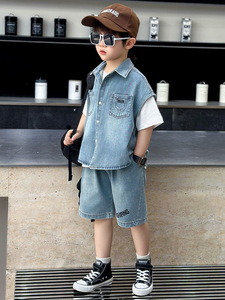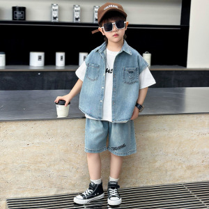 ハンサムボーイスーツ半袖夏韓国版2025新しい子供用デニムベストジャケットスリーピーストレンド服
