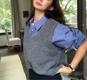 两件套春秋韩系风复古格子衬衫女+宽松休闲针织背心马甲套装潮