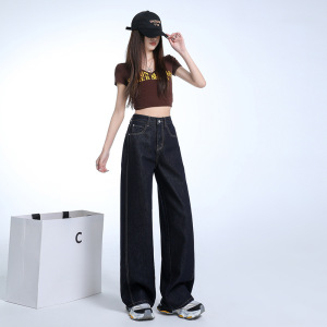 丹寧藍原色広脚ジーンズ女性2025春夏新作高腰曲刀広脚ズボン