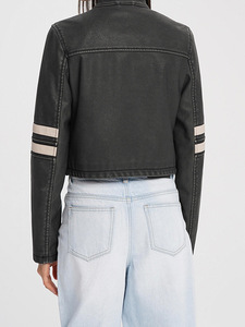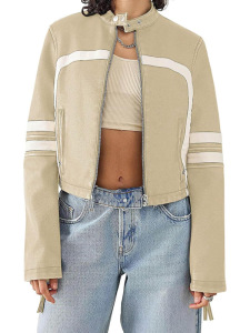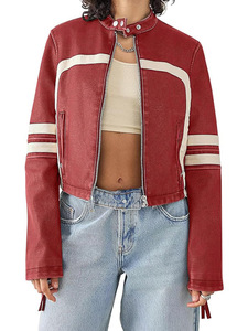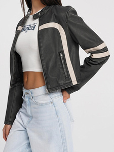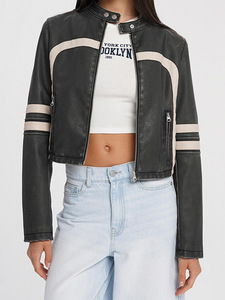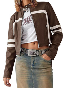 2025亚马逊机车服女士春秋季短款皮夹克拼色PU皮衣外套撞色设计