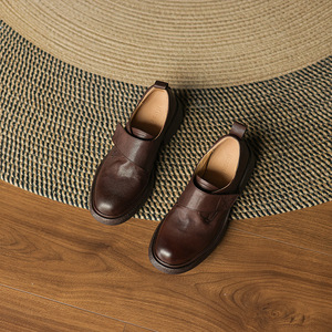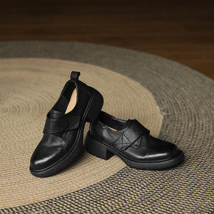 头层牛皮复古厚底乐福鞋女魔术贴运动轮胎底单鞋圆头内增高小皮鞋