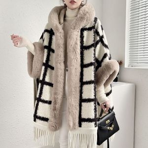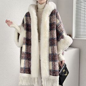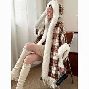 大きいサイズの秋冬は帽子の外に毛のマントのストールの女性の大きい毛の襟と帽子の格子のゆったりして厚いコートを持ちます。