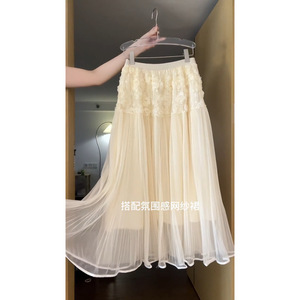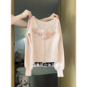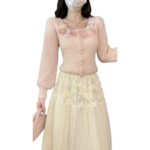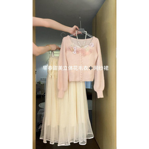 2025春新作ピンク甘くて優しいレディスタイル立体花ニット+ベージュスカートスーツ