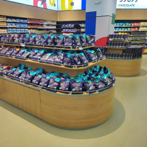 スーパーマーケットの棚の展示棚の販促棚の積み上げの展示台のデパートの間食の中島の棚の収納棚