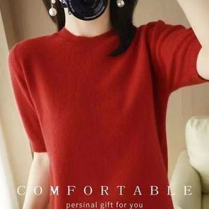 ニット半袖薄手トップスレディース Tシャツ 2025 春と秋の半袖ウールボトムシャツラウンドネックミッドスリーブルーズ卸売