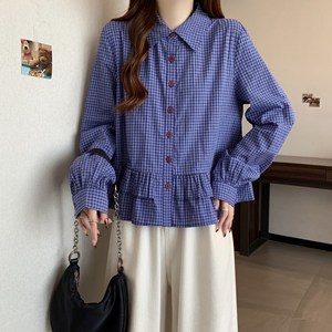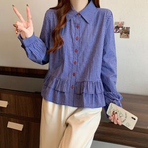 蓝色格子衬衫女装2025早春新款宽松显瘦甜美娃娃衫荷叶边下摆上衣