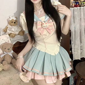 ほのかに太ったmmの甘いギャルの純欲風のスーツの女性の夏の子供の襟のシャツの蓬蓬蓬蓬は半身のスカートの2つのセットをつなぎます。