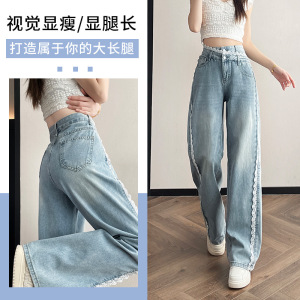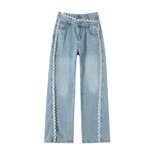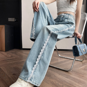 レースのジーパンの女性2025年春秋の新型のデザイン感のレースのつなぎ合わせはやせている小さい背のまっすぐな筒の広い足のズボンを現します。