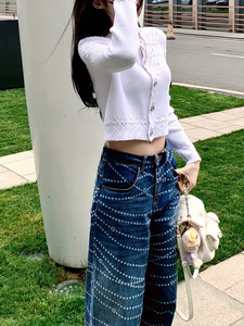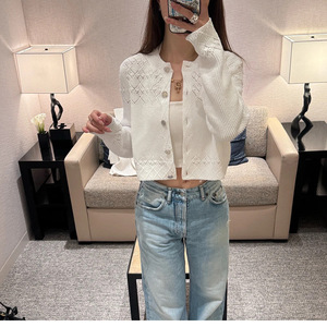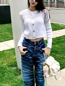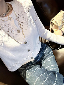 新しい中空菱形フックパターンフレンチレトロ長袖ショートカーディガン白ニットセータージャケット女性の新しいトップ