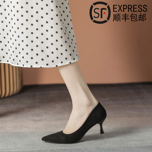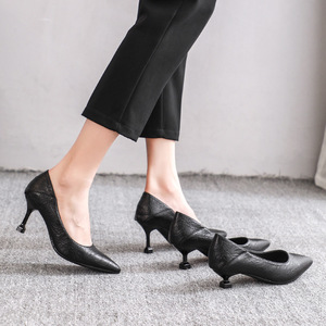 足が疲れにくい女性用ハイヒール、2025年新作フレンチ通勤仕事プロブラックポインテッドトゥソフトレザーシューズ