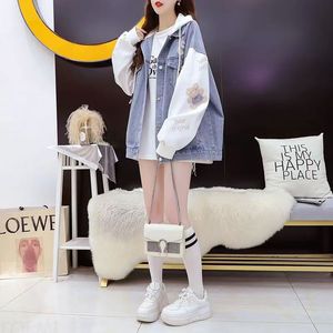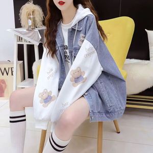2025春秋新款韩版慵懒风设计感假两件连帽牛仔外套