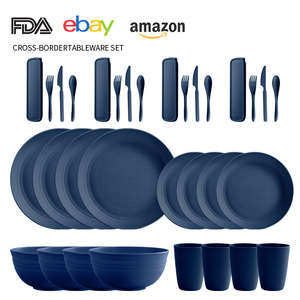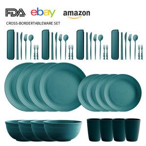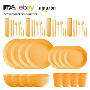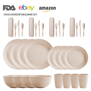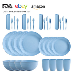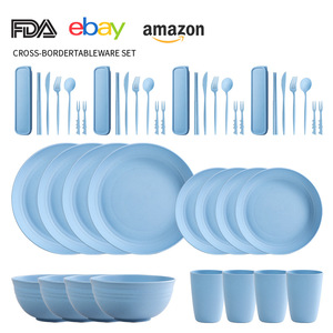 国境を越えたアマゾン食器皿食器セットプラスチックpp小麦わら皿ボウルカップ44セット食器ナイフフォークスプーン