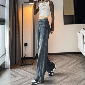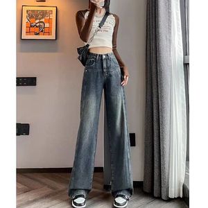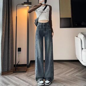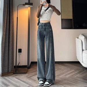 セメントグレーストレートジーンズ女性のための 2025 春と秋の新しいハイウエストルーズスリミングワイドレッグパンツ