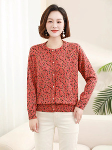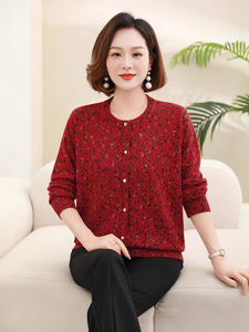 おばあちゃんの秋ニットプリントトップス中高年ママ新作カーディガン60歳70歳老婦人コート女性