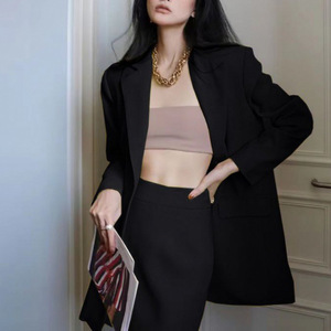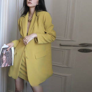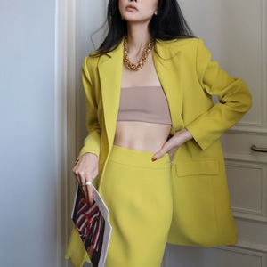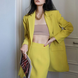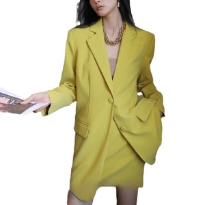 高級マスタードイエローのミドル丈プロフェッショナルブレザー+ショートハーフレングススーツ女性用ツーピーススーツ