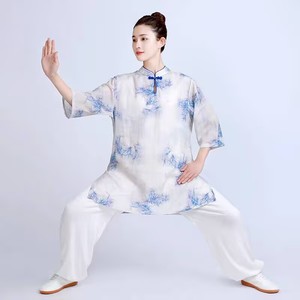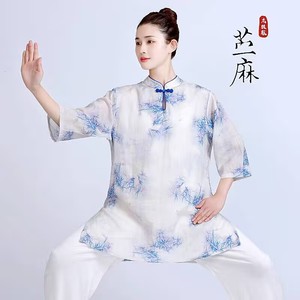 ハイエンド改良された新しい女性用ミッドスリーブ太極拳スーツ夏綿とリネンの薄い半袖ラミー太極拳練習スーツ中国風