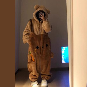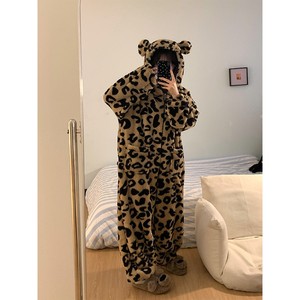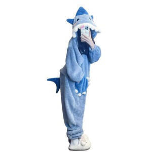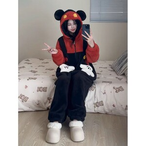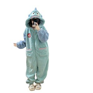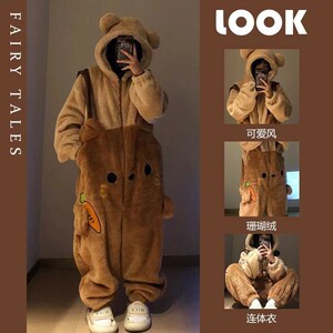 卡通可爱背带熊鲨鱼米奇连体睡衣男女秋冬季珊瑚绒加绒情侣家居服