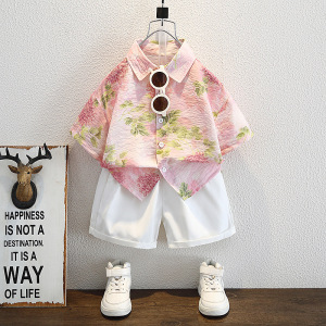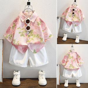 男の子サマーシャツスーツ2025新作子供花柄シャツ薄手男の子香港風ツーピーススーツトレンディでハンサム