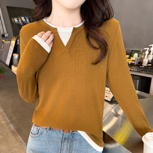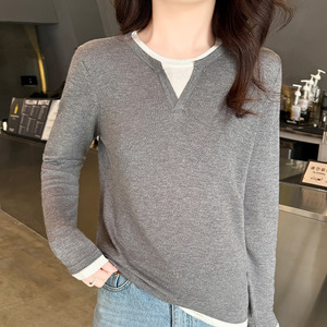 气质通勤美利奴精纺羊毛套头假两件针织衫女春秋长袖薄款上衣新款