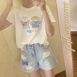 透かしの通気性のプリントの広い松の肩の半袖のtシャツの女性の韓国のinsの爆発の基礎は白い日本の上着を合わせます。
