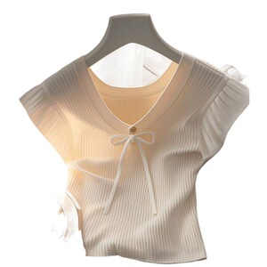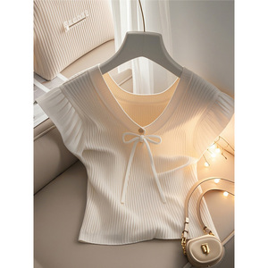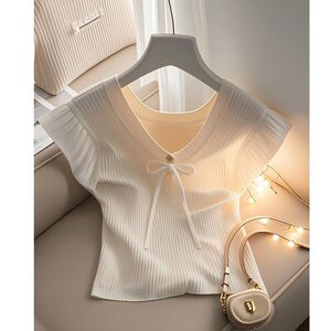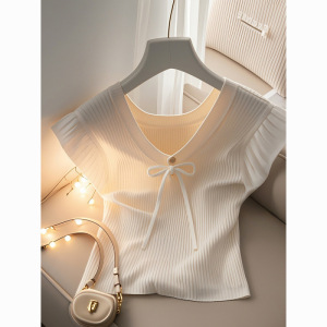 フレンチシックで美しいデザインのニッチトップ夏薄手スリムフィットホワイトニット半袖Tシャツ女性用