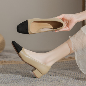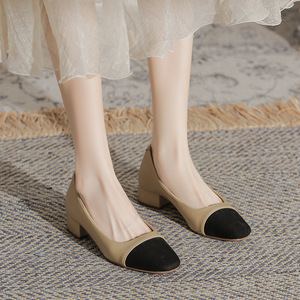 シープスキンカラーブロックスモールフレグランススタイル厚底ヒールシューズ女性用2025春秋新作ミディアムヒール浅口シューズフレンチハイヒール