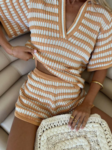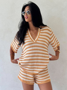 ストライプの衝突色のカジュアル風vネックの頭の長袖のニットの上着のショートパンツのスーツの女性の欧米の越境する夏の新型