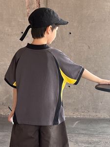 2025年夏新作 子供用カラーブロック半袖Tシャツ 男の子Vネックアメリカンスポーツトップス おしゃれな男の子用半袖Tシャツ