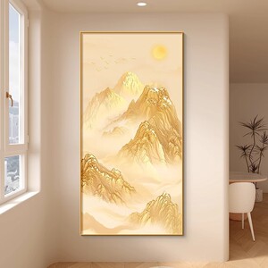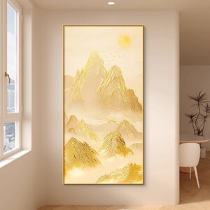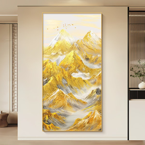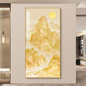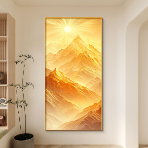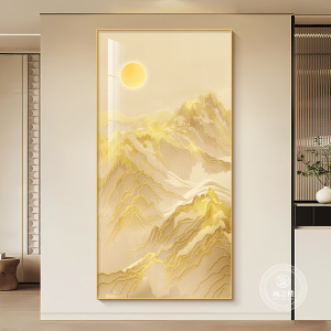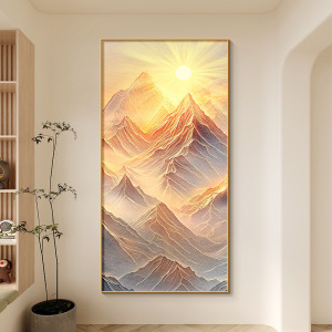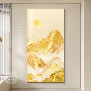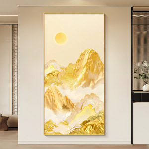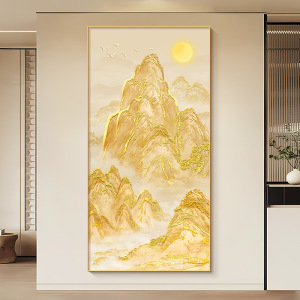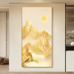 日照金山玄関装飾画現代シンプルで高級な金箔階段の間には、山に寄りかかった客間の壁画があります。