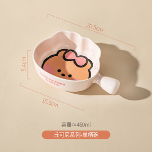 ブラウン熊はハンドル付きの陶磁器焙煎チーズグラタンを持っています。