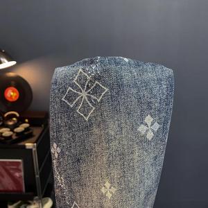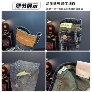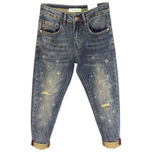 2025新款男士牛仔裤春夏款修身小脚裤高端弹力蓝色印花破洞九分裤