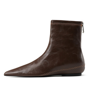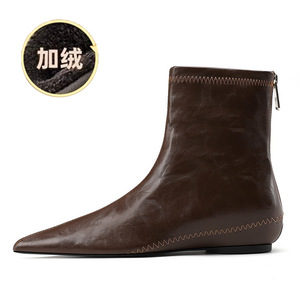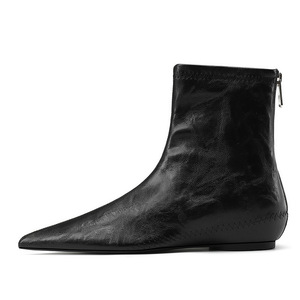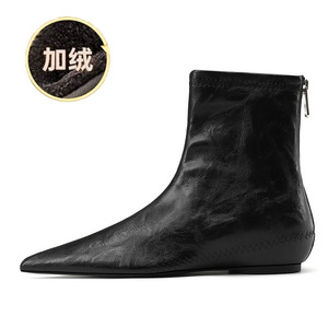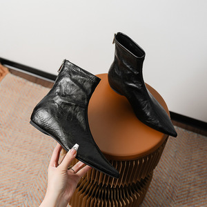 6383-1复古手抓纹女靴短筒靴显瘦百搭内增高低跟内增高尖头短靴